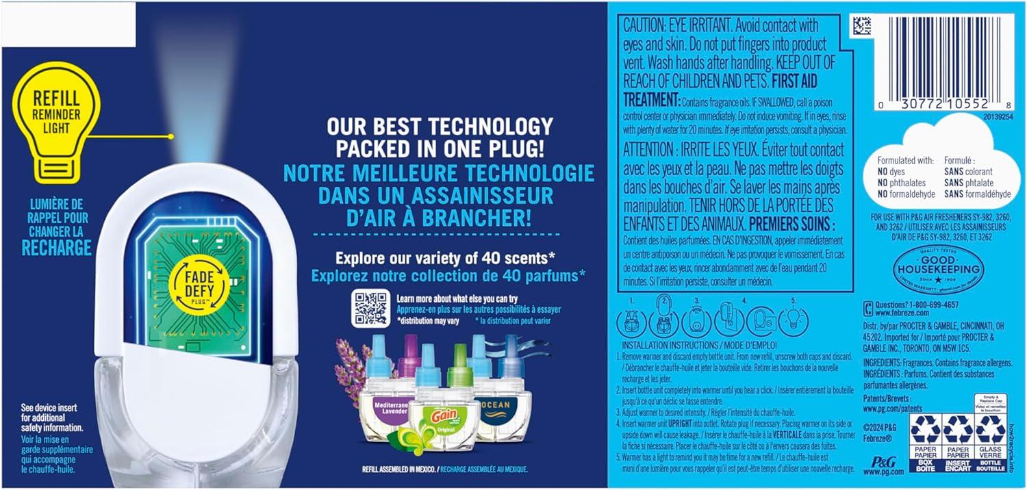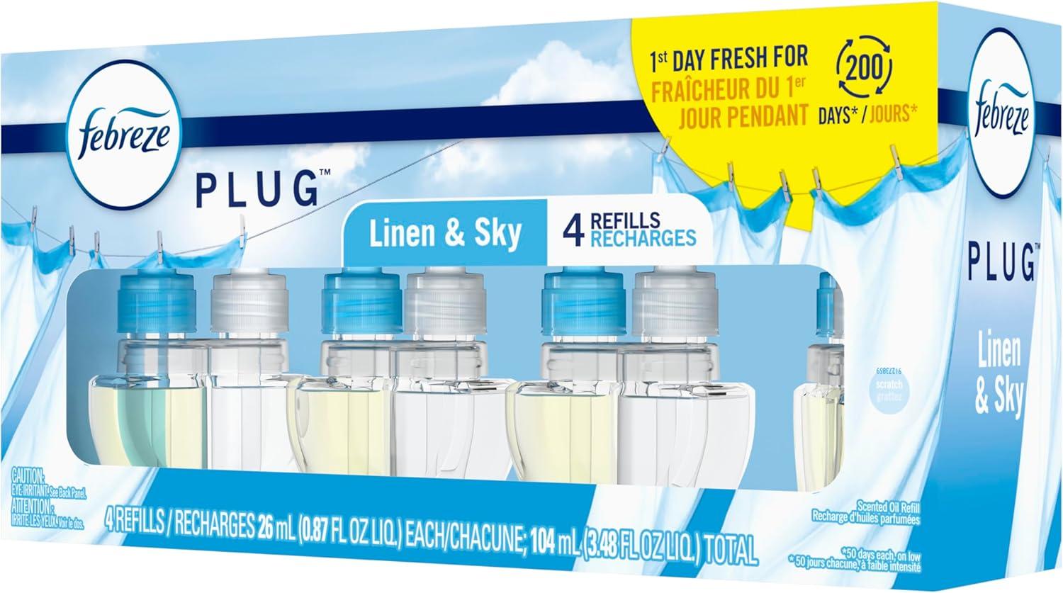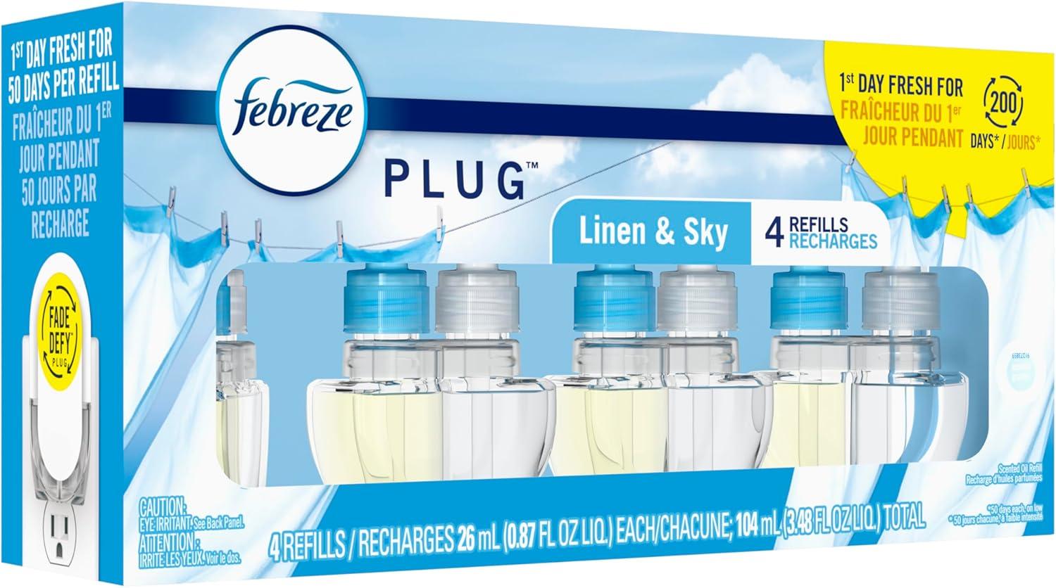 Have you experienced your plug air freshener scent fading? Good news: Febreze Fade Defy PLUG Air Freshener stays true to its name, delivering a first day fresh that lasts a full 50 days (on low setting). Ready to hit refresh and be an A+ odor fighter? Just refill the Febreze Fade Defy PLUG and plug it into any outlet (they’ll even rotate if your outlet is upside down) in any high-traffic area of your home… the kitchen, bathroom, or anywhere else odors like to linger. Bonus? When it’s time for a refill, the automatic air freshener will let you know with its handy low-level indicator light. And this scent refill pack comes with four Fade Defy PLUG refills so you can keep that freshness going. Looking for an instant burst of fresh on funky fabrics? Give Febreze Fabric Refresher a try.