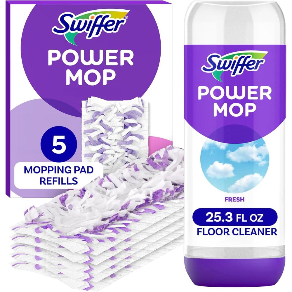Includes 5 PowerMop Multi-Surface Mopping Pad Refills and 1 25.3 fl oz bottle of Swiffer PowerMop Floor Cleaning Solution, Lavender Scent