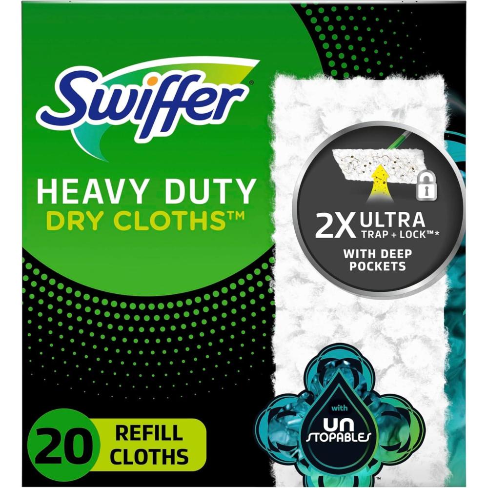 Swiffer Sweeper Heavy Duty Multi-Surface Dry Sweeping Cloths remove up to 95% of allergens* and TRAP + LOCK™ 2X more dirt, dust, and hair**, allowing you to clean all your hard floor surfaces quickly and easily. Use with your Swiffer Sweeper Dust Mop – the convenient combination of a broom and mop for a quick and easy clean. Experience Lasting Freshness*** with Swiffer Heavy Duty Dry Sweeping Cloths, now in the Fresh, Clean, and Airy Unstopables Scent you love! *Leaves behind up to 1 hour of freshness after initial product use *Common inanimate allergens from cat and dog dander & dust mite matter **vs. Multi-Surface Swiffer Sweeper Dry Cloth ***Leaves behind up to 1 hour of freshness after initial product use